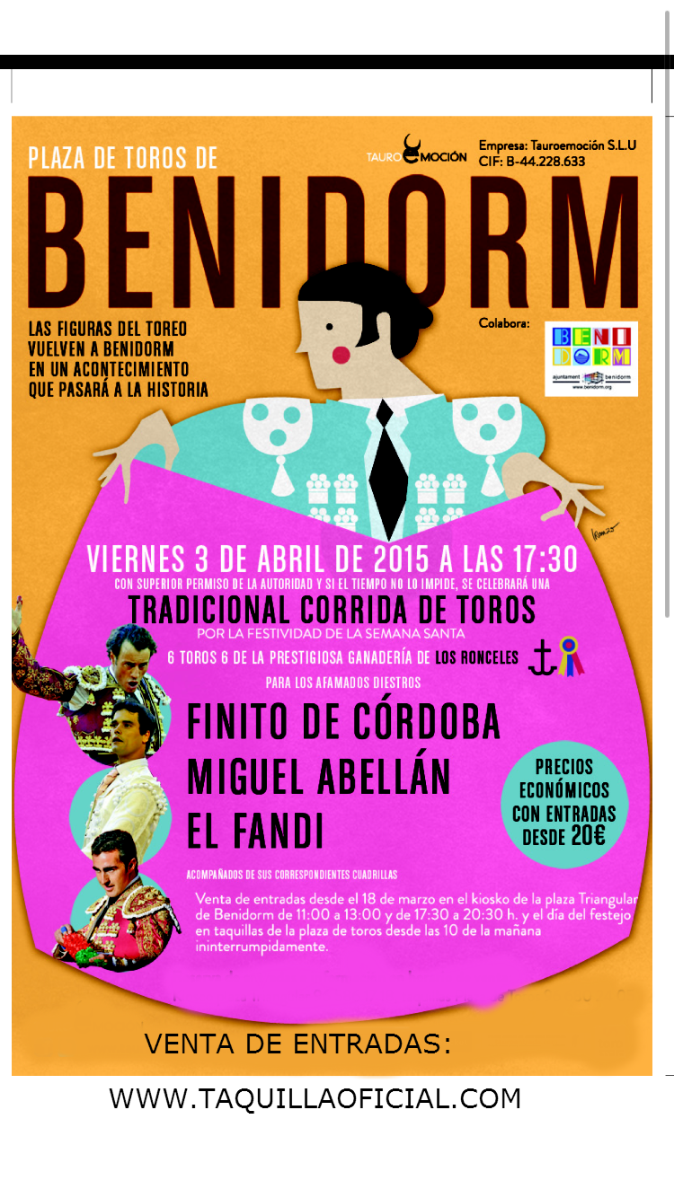 En esta sección de Taquillaoficial.com, usted podrá comprar oficialmente, abonos, entradas, tickets o boletos para asistir a cualquier evento taurino celebrado en la Plaza de Toros de Benidorm en el año 2025. Taquillaoficial.com es una empresa encargada de vender oficialmente las entradas de la Plaza de Toros de Benidorm en el año 2025 de manera online y de una forma segura, garantizando sus entradas una vez compradas al 100%. A su vez en Taquillaoficial.com podrá hacer la reserva de sus abonos y entradas para los toros en Benidorm con anterioridad al día de inicio de la venta de entradas y así no se perderá usted su evento preferido.