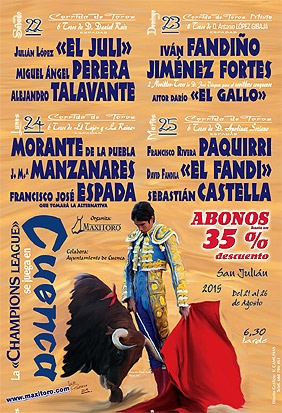 En esta sección de Taquillaoficial.com, usted podrá comprar oficialmente, abonos, entradas, tickets o boletos para asistir a cualquier evento taurino celebrado en la la Plaza de Toros de Cuenca en el año 2025. Taquillaoficial.com es una empresa encargada de vender oficialmente las entradas de la Plaza de Toros de Cuenca en el año 2025 de manera online y de una forma segura, garantizando sus entradas una vez compradas al 100%. A su vez en Taquillaoficial.com podrá hacer la reserva de sus abonos y entradas para los toros en Cuenca con anterioridad al día de inicio de la venta de entradas y así no se perderá usted su evento preferido.