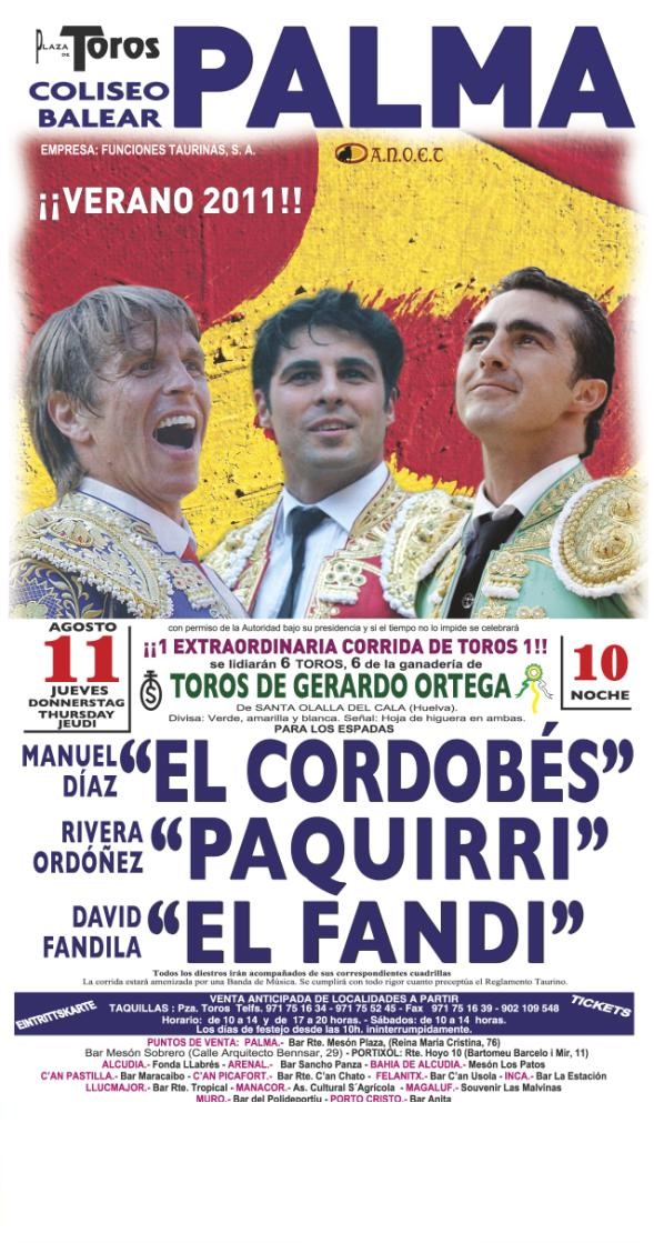 En esta sección de Taquillaoficial.com, podrá comprar oficialmente, abonos, entradas, tickets para asistir a cualquier evento taurino celebrado en la Plaza de Toros de Palma de Mallorca en el año 2025. Taquillaoficial.com es una empresa encargada de vender oficialmente las entradas de la Plaza de Toros de Palma de Mallorca en el año 2025 de manera online y de una forma segura, garantizando sus entradas una vez compradas al 100%. A su vez en Taquillaoficial.com podrá hacer la reserva de sus abonos y entradas para los toros en Palma de Mallorca con anterioridad al día de inicio de la venta de entradas y así no se perderá usted su evento preferido.